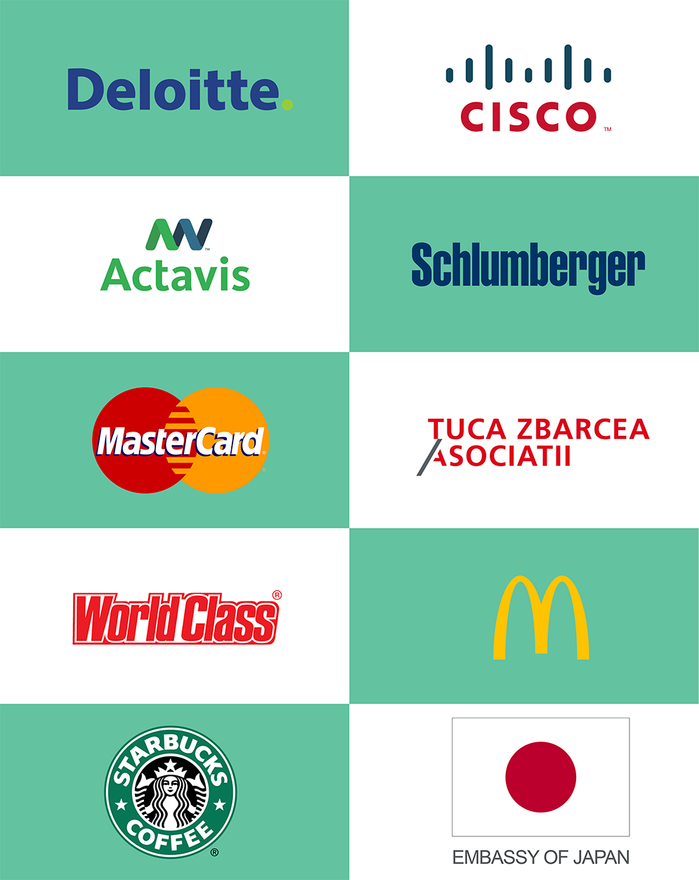 Deloite, Cisco, Actavis, Schlumberger, Mastercard, Tuca Zbarcea si Asociatii, World Class, Embassy of Japan, Satrbucks, McDonalds and more.